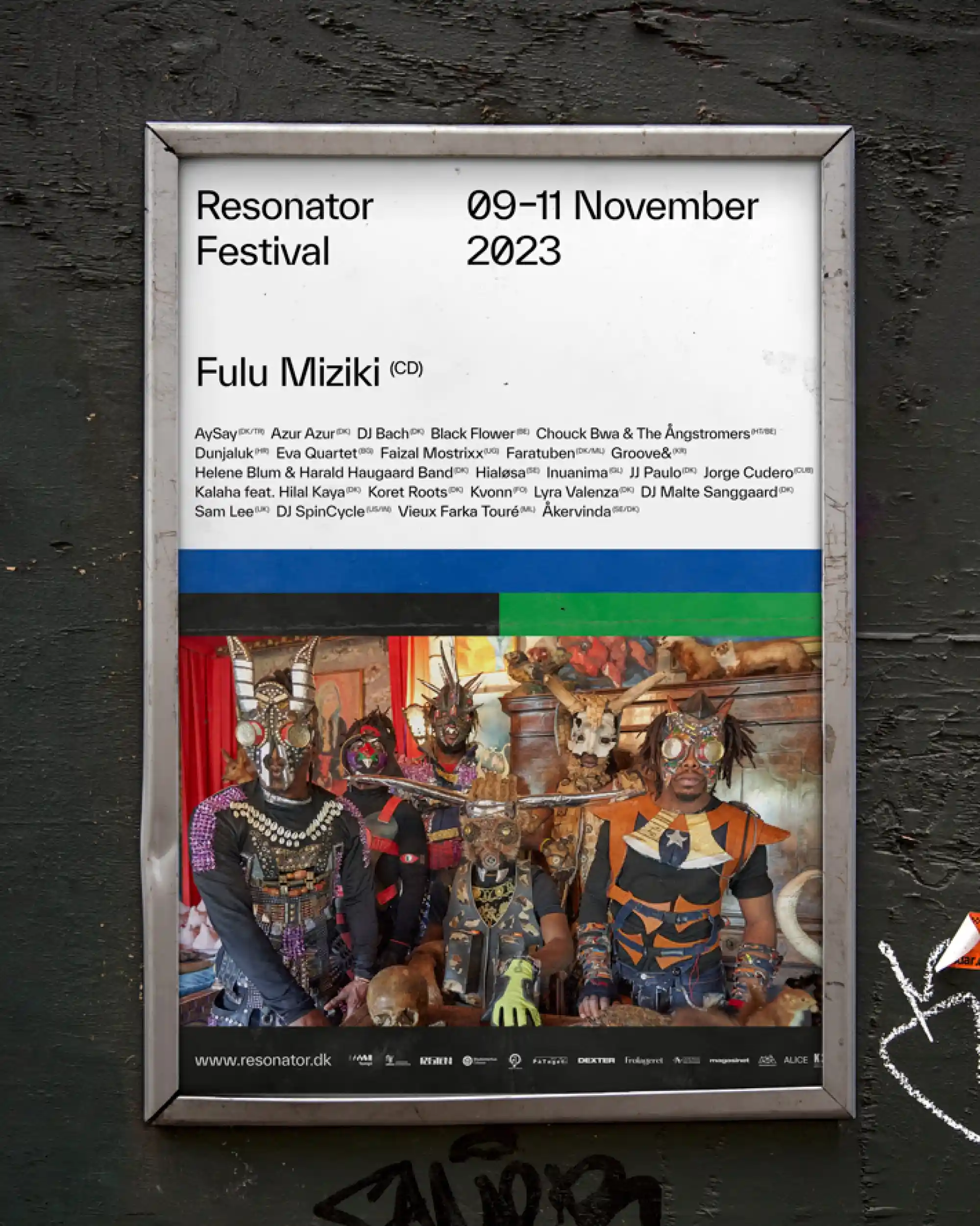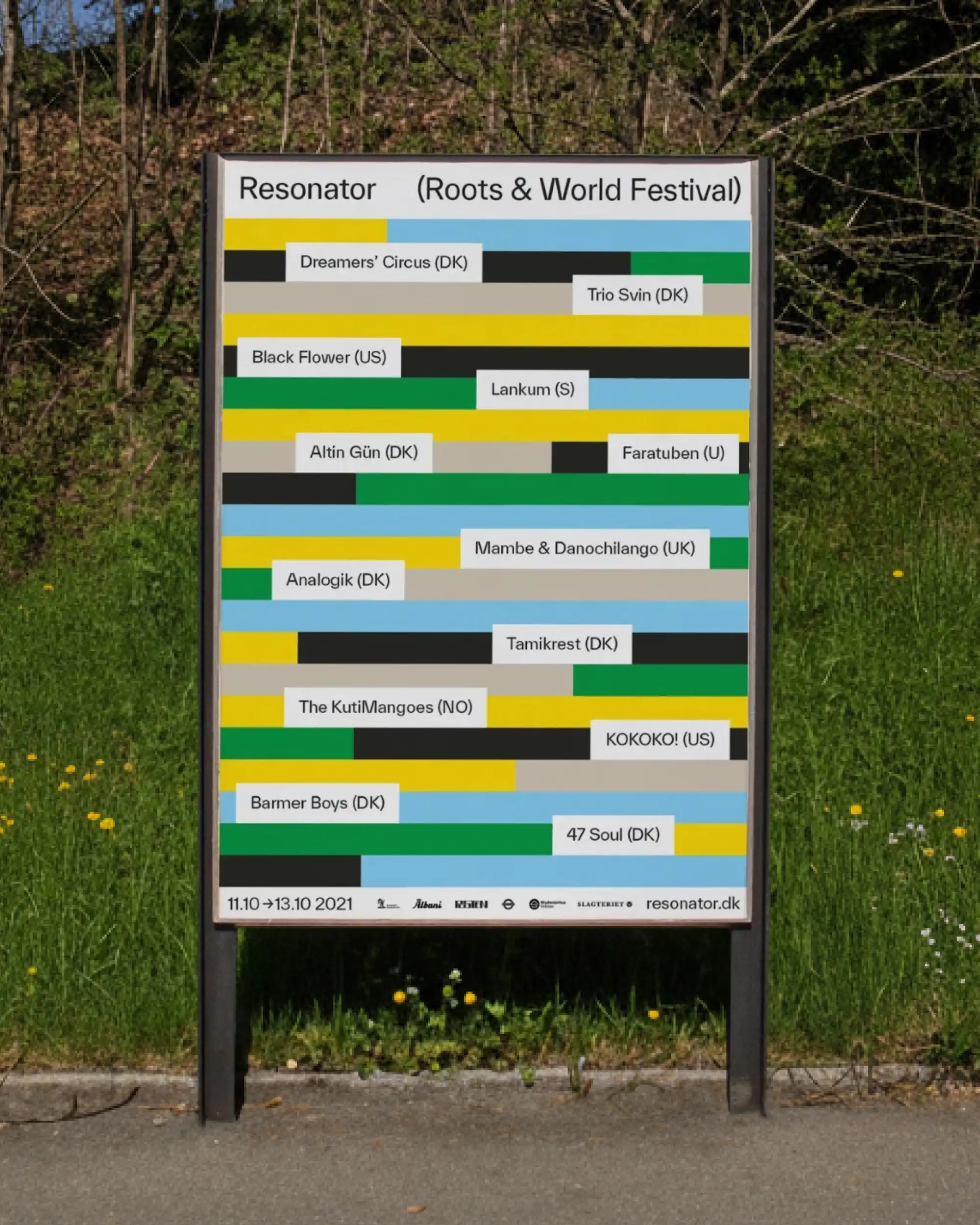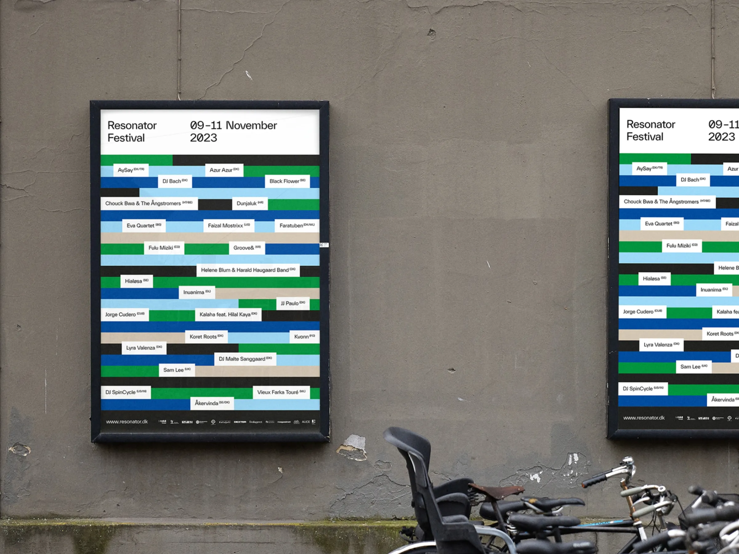 Resonator is an international roots and world music festival based in Odense. Artists from 15 to 18 countries. The brief was one identity that could contain music from across continents and traditions. Unified but not uniform. Consistent but never repetitive. The visual system borrows from the record store. Flipping through vinyl to discover something new. The palette pulls from flags across the globe. Green, blue, yellow, red for the range of world music. Clay to symbolize the specific tie to roots music. The colors unify. The layout never repeats. The logo a clear reference to flags. The team now maintains the identity internally. A timeless systems, that adapts with the festival.